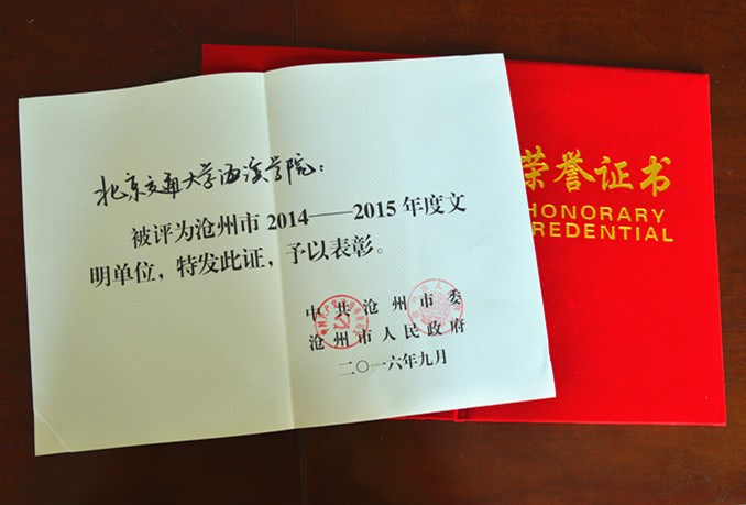 日前,中共沧州市委、沧州市人民政府命名表彰2014-2015年度文明单位,我校荣获市级“文明单位”荣誉称号。