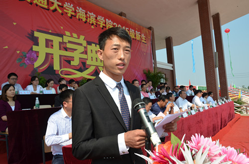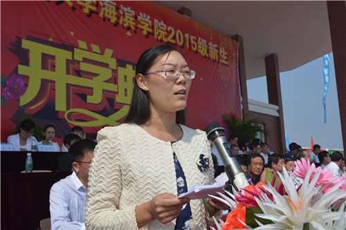 基础教学部思政教研室王小红代表全体老师,土木工程系土木1304班孙宇代表全体在校生也分别发言。外语系英语1501班夏婧一同学代表全体新生发言并带领全体新生庄严宣誓。