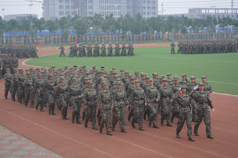 2014级军训团整队完毕之后,王化深院长宣布阅兵式正式开始。在倪立萍团长的陪同下,王化深院长对军训团进行了检阅。接着,举行分列式表演,各方阵喊着嘹亮的口号,迈着整齐的步伐,依次通过主席台。随后,进行军事科目汇报表演,包括队列班表演、军体拳方阵表演与红歌拼字方阵等,精彩的表演赢得了在场观众的阵阵掌声。