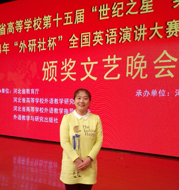 本届大赛分为专业学生组、非专业学生组、青年教师组等五组,同时进行比赛。经过即兴演讲、现场辩论和知识抢答等环节的激烈角逐,我院师生在比赛中各展风采,表现出了良好的精神风貌和优秀的外语水平。最终,张丽老师荣获青年教师组二等奖(排名第15名),连芳老师荣获青年教师组三等奖。英语专业学生智春妍、蒋玲燕荣获专业学生组三等奖,机械专业学生王梦遥、工商专业学生杜文媛荣获非专业学生组三等奖。