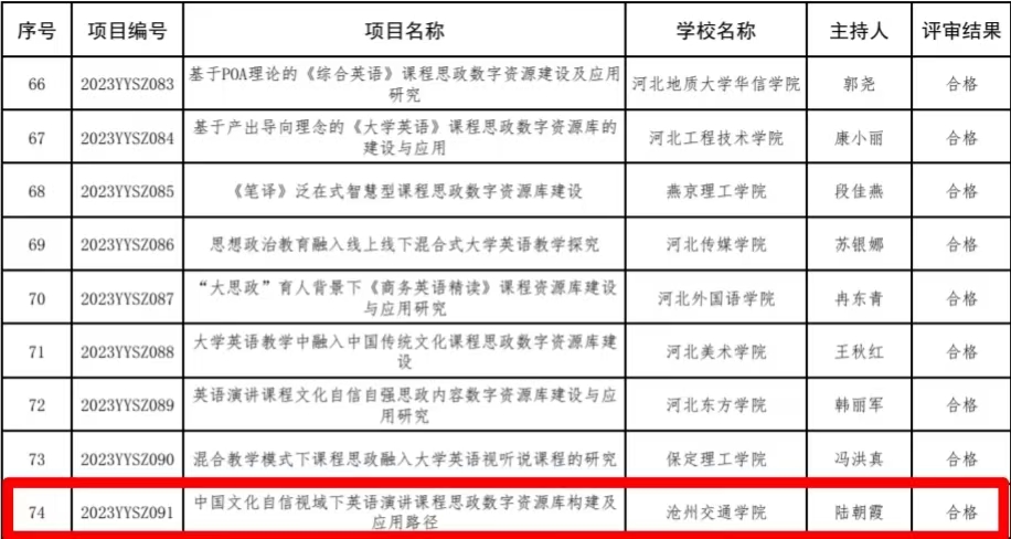 近日,河北省教育厅发布了《关于公布2025年河北省高等学校英语教学改革(课程思政数字资源库)研究与实践项目结题鉴定结果的通知》(冀教高函〔2025〕6号),由我校外国语学院陆朝霞老师主持的“中国文化自信视域下英语演讲课程思政数字资源库构建及应用路径”项目顺利通过结项验收。