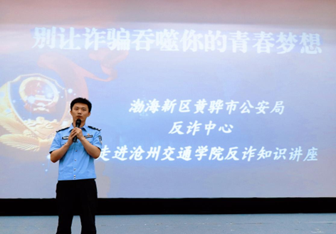 为强化2025级新生安全防范意识,筑牢校园安全防线,9月15日,我校联合渤海新区黄骅市公安局反诈中心、骅西派出所,在天佑会堂举办新生反诈知识讲座。活动聚焦大学生群体高发的电信网络诈骗问题,通过专业宣讲与互动问答相结合的形式,为新生上好法治“开学第一课”。