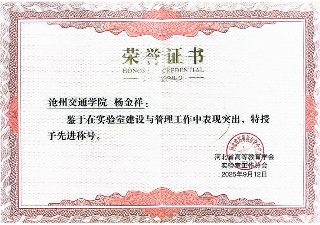 近日,河北省高等教育学会公布了2025年实验室建设与管理先进评选结果,经专家评审和理事长会议审议,我校杨金祥老师荣获“河北省高校实验室工作先进个人”荣誉称号。