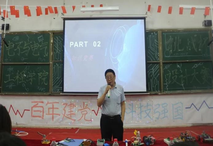 为培养我校学生的创新意识,提高实践能力,感受科技乐趣,我校电子与电气工程学院5月23日在知行楼A301成功举办以“百年建党,科技强国”为主题的首届科技“挑战杯”电子设计大赛。电子与电气工程学院院长李金平、团委书记李艳梅、17级辅导员李涛、科协指导教师赵莹及各参赛队伍的指导教师滕岳、陈静、项璟、张亚娟、陈剑美、殷文雪及轨道交通学院教师陈雷莅临本次比赛。